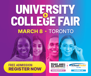 Toronto’s Study and Go Abroad / SchoolFinder Fair is on Sunday, March 8 from 1-5pm at Toronto Reference Library. Explore colleges, universities, gap year, and study abroad options — plus don’t miss the free ScholarshipsCanada seminar at 12pm!